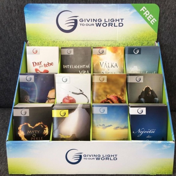 Stojan s přihrádkami na dvanáct druhů letáčků.